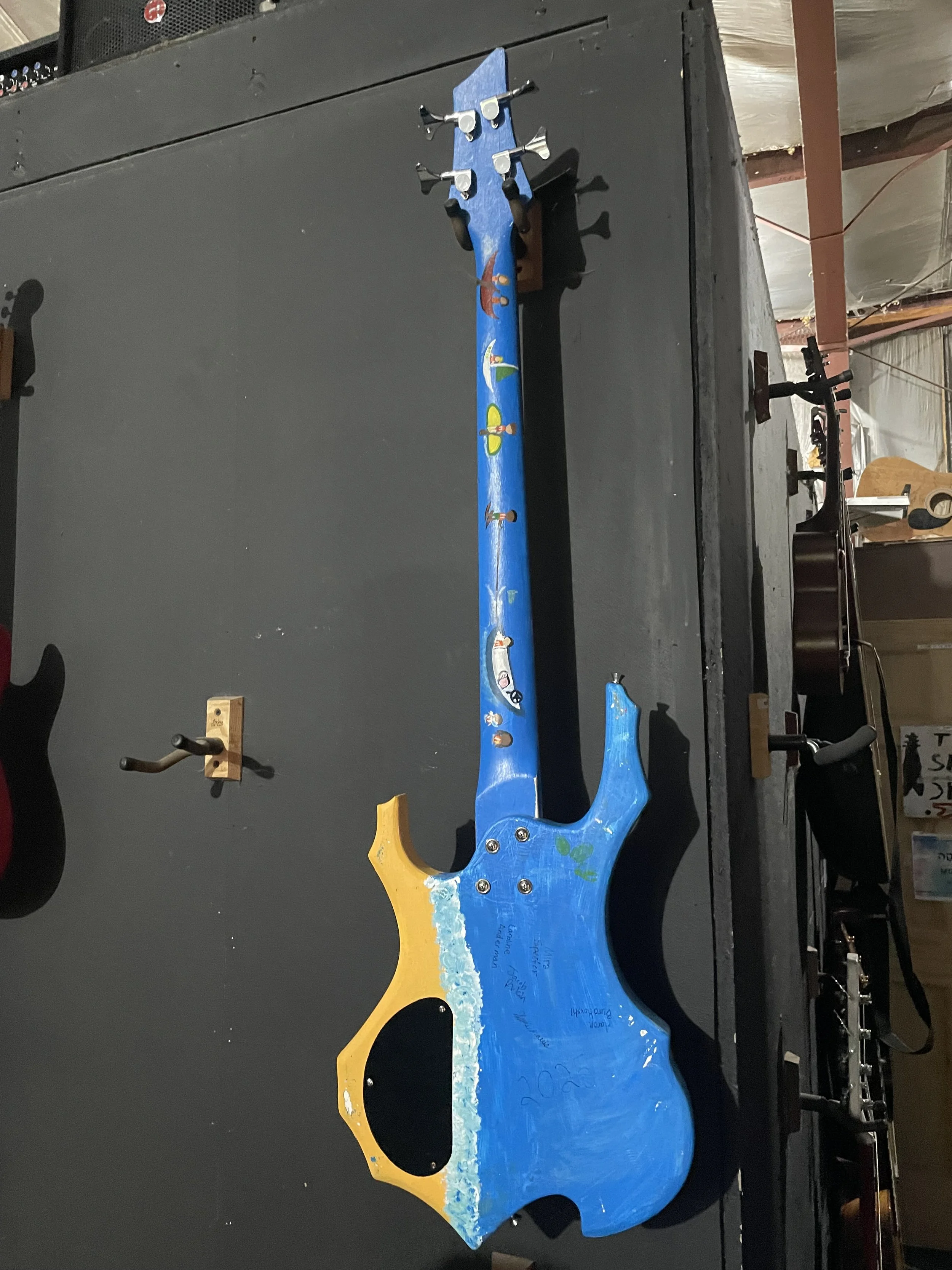 In the instrument building hobby Mira, Caroline, Shai, Jacob, Jaden, Jonah, EJ, Eli, Joey, Aaron, and Max managed to paint and build a bass guitar. It even works! Marvel at the beauty of our new blue wonder!